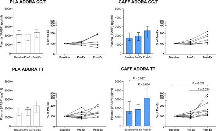 Caffeine exacerbates exercise-induced gut cell damage and is influenced by ADORA2A genotype but not CYP1A2 genotype: A preliminary study