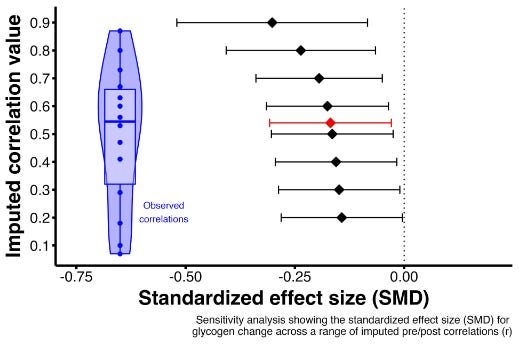 🔋 Carb ingestion was associated with a small but statistically significant muscle glycogen-sparing effect (SMD = -0.16)
