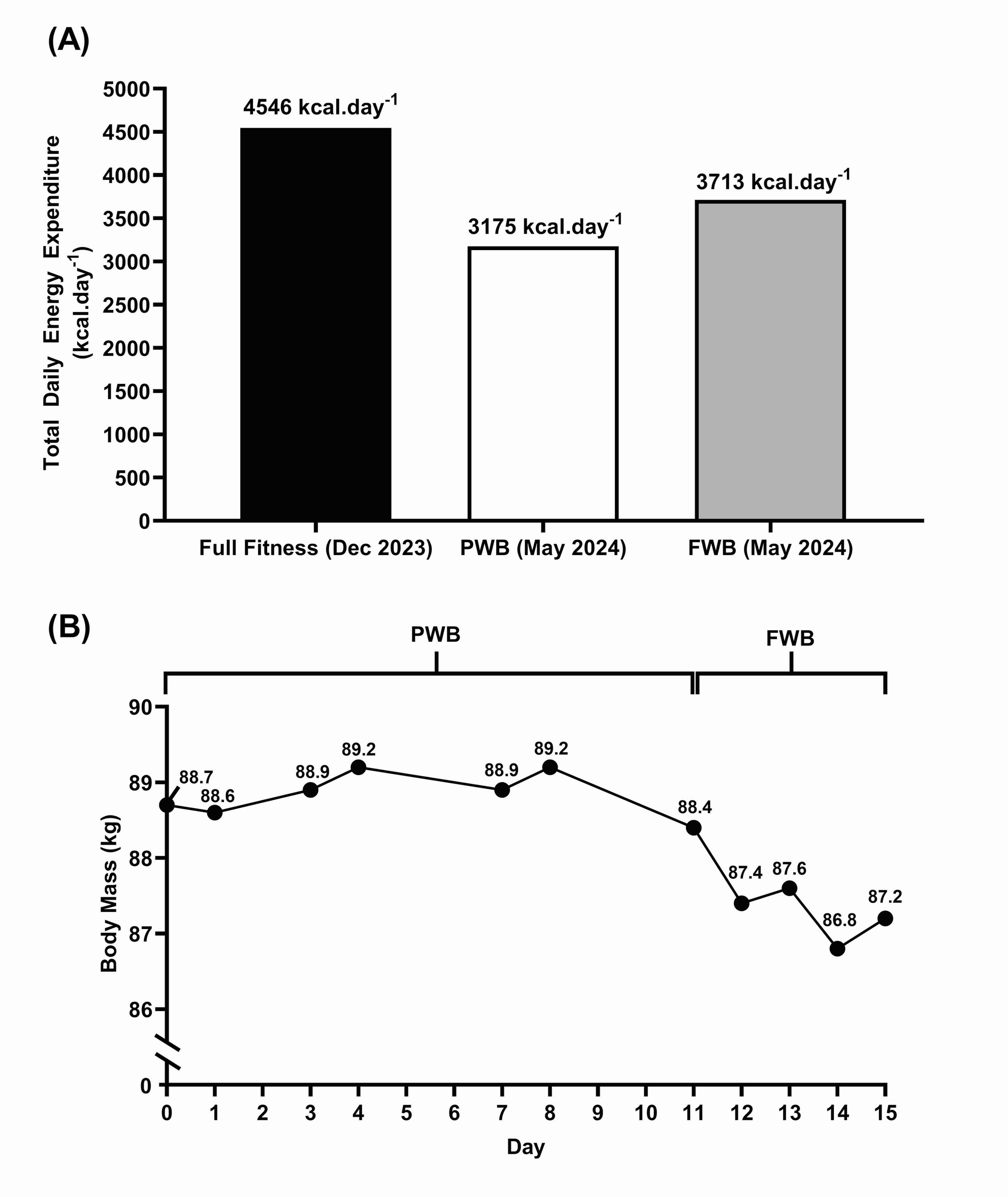 📉 Body mass reduced in both PWB (-0.3 kg) and FWB phases (-1.2 kg)