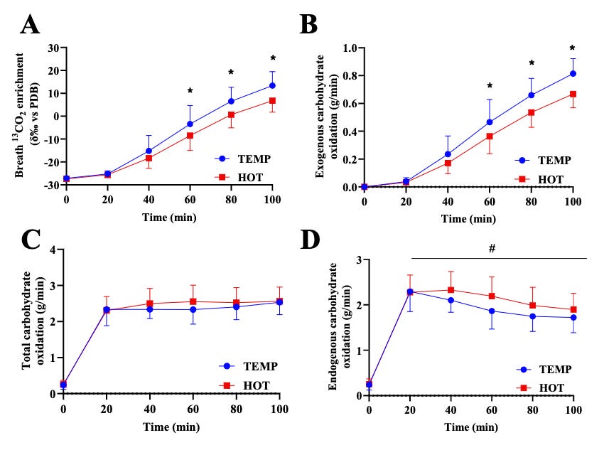 Even with adequate hydration, running in a hot environment reduces exogenous carbohydrate oxidation 🚨