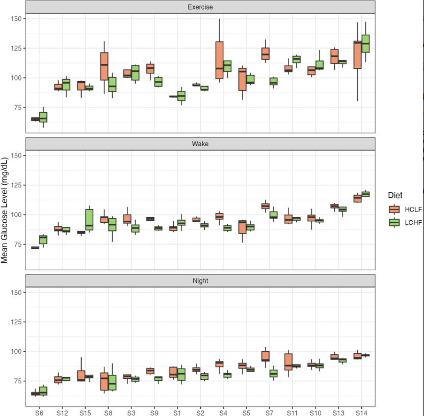 Mean glucose values were significantly higher during exercise vs wake and night phases irrespective of diet 🚴♂️
