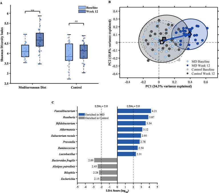 🦠 The Mediterranean diet showed a significant increase in alpha diversity (Shannon index: +11.2%)