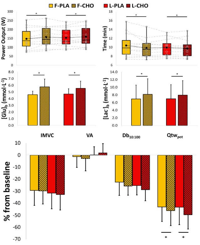 TT performance was significantly better after consuming carbs in both phases vs placebo ⏱️
